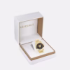 This masculine timepiece features a three-dimensional floating Medusa set between two crystals with a two-hands movement system. A Greca pattern features on the inner dial, while an engraved Versace lettering at the ring frames the case. The accessory is finished with a metal band with stitching detailing. All Versace watches are guaranteed by the ‘Swiss Made’ marking. All stainless steel is recycled.
